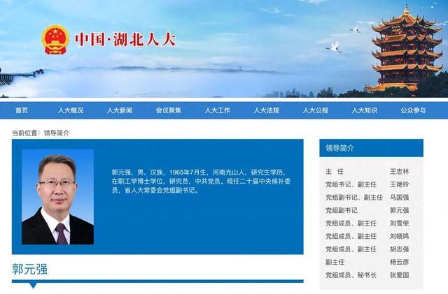 近日,湖北省人大常委会网站“领导简介”栏目更新显示,郭元强已被任命为湖北省人大常委会党组副书记。湖北省人大常委会网站“领导人简介”栏目已更新。郭元强是第二十届中央候补委员。曾任湖北省委常委、武汉市委书记。图为郭元强个人资料。曾在广东、江苏等地工作。公开资料显示,郭元强1965年7月出生,河南光山人。早年在广东省工作,历任茂名市委常委、副市长、高州市委书记、市委主任。省对外贸易经济合作厅、省商务厅厅长,珠海市委书记。 2018年1月,郭元强升任江苏省副省长。 2019年10月任江苏省委常委、秘书长。 2021年2月,任省委组织部部长。同年4月,他辞去省委秘书长职务。 2021年9月,郭元强跨省履新,出任湖北省委常委、武汉市委书记。今年10月,武汉市市长盛跃春接替郭元强出任湖北省委常委、武汉市委书记。市委。至此,郭元强的新立场已经明确。来源 |湖北省人大常委会网站,长安街知事扩读国务院近期任免6名干部,3名地方政府来京履新。 10月27日,国务院任免国家工作人员。任命柯继新为工业和信息化部副部长;任命陈绍旺为住房和城乡建设部副部长;庞小刚任国务院国有资产监督管理委员会副主任;芮文彪任国家知识产权局副局长;任命王伟为国家消防救援局副局长。免去卢鹏起国家知识产权局副局长职务办公室。任命柯继新为工业和信息化部副部长。图为柯继新简历。公开简历显示,柯继新,男,汉族,1968年1月出生,MBA,中共党员,教授级高级工程师、高级经济师。早年从商,历任杭州市政府党组成员、副市长,杭州市钱塘新区党工委书记、钱塘区委书记,杭州市委常委、市政府党组副书记,杭州市钱塘新区党组常务副市长书记。 市政府、市政府党组常务副市长、市委常务副书记市领导小组、常务副市长市长。截至2023年3月,任浙江省经济和信息化厅党组书记、厅长,兼任浙江省中小企业局局长。 2023年7月任浙江省副省长、省政府党组成员。此时,我前往北京履新。任命陈绍旺为住房和城乡建设部副部长。图为陈绍旺简历及照片。公开简历显示,陈绍旺,男,汉族,1971年2月出生,中共党员,研究生学历,经济学博士。曾任天津港保税区管委会经济发展局局长、总经理2015年12月起任天津市天宝控股有限公司董事、中天航空产业投资有限公司董事长,任天津市西区党委副书记、代区长。 2016年1月任天津市西青区区长。 2018年5月任天津市和平区委书记。 2020年5月任辽宁省大连市市长,现赴北京履新。庞小刚被任命为国务院国有资产管理委员会委员 图为庞小刚副主任简历。公开简历显示,庞小刚,男,1972年6月出生,硕士,工程师。 2020年任国家领导班子副总经理、党组成员,后任国家领导班子主任、副书记国家电网公司董事、总经理、国家电网公司领导班子副书记。现在,我有了一个新的角色。任命芮文标为国家知识产权局副局长。图为芮文彪简历照片。公开简历显示,芮文彪,男,1970年2月出生,汉族,中共党员,法学硕士。曾任上海市第一审判委员会委员。历任上海市高级人民法院审判委员会委员、民事三审判庭庭长,上海市知识产权局副局长。 2018年11月任上海市知识产权局党组书记、局长。此时,我前往北京履新。任命王伟为国家消防救援局副局长。这图为王伟简历。公开简历显示,王伟,男,汉族,1971年5月出生,在职研究生学历,工学硕士学位,中共党员。曾任国家消防救援局党委委员、政治部主任、该局党委书记、消防救援局长助理。