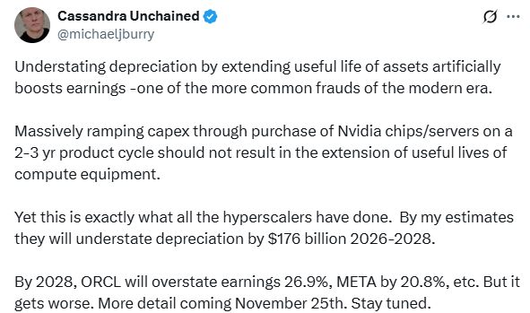 财联社11月12日电(编辑牛占林)因押注次贷危机而名声大噪的《大空头》人物原型、投资者迈克尔·伯里(Michael Burry)再次掀起波澜,瞄准了美国股市最热门的人工智能(AI)赛道。他指责美国一些最大的科技公司在人工智能热潮中通过激进的会计做法“夸大”利润。与此同时,华尔街各大投行高管和知名做空机构频频发出美股可能出现回调的警告。伯里在社交平台发文,他写道:“通过延长资产的使用寿命来低估损失成本,从而增加利润,是现代财务报告中最常见的伎俩之一。以英伟达芯片和服务器为例,产品周期只有两三年,资本支出的大幅增加让对于企业来说应该不是问题。所有大型科技公司都这样做。公司在估计资产寿命时有很大的自由裁量权。 2008年金融危机前的次级抵押贷款市场,名义市场价值超过10亿美元,继上周下跌7%后下降了6%; Palantir股价继上周下跌11%后反弹约9%。低的。最后,伯里表示他将在11月25日公布更多细节,让追随者拭目以待。与此同时,日本软银团队做出惊人举动:将NI股东清盘给“AI芯片霸主”英伟达,并砸出58亿美元,加剧了人们对AI热潮可能沉没的担忧。软银表示,此次出售的收益将支持 5000 亿美元的 Stargate 计划,并承诺向 OpenAi 提供高达 400 亿美元的资金。然而,交易的时机加深了市场的怀疑,投资者担心人工智能行业的估值可能领先于基本面。许多分析师认为据了解,软银出售英伟达股票表明,儿子正义可能判断英伟达股价疯狂上涨已经结束。不过,也有分析师指出,软银对英伟达投资的“时机”始终不能令人满意。