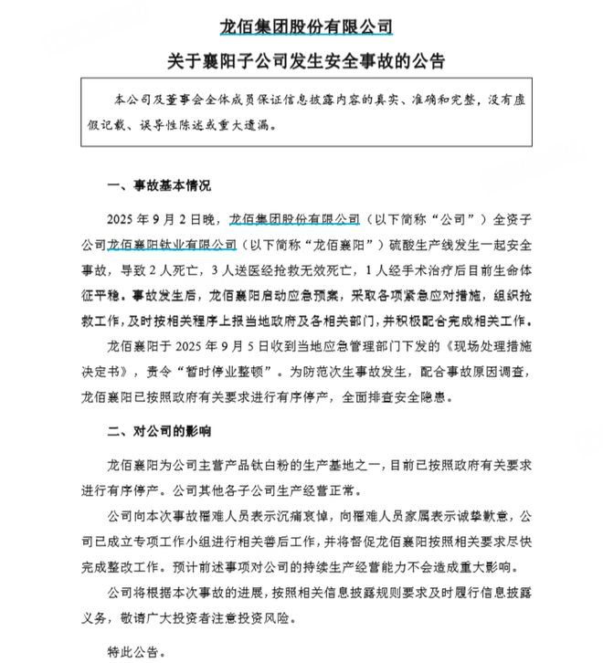 调查了五人死亡引起的事故,而Longbai集团的基地原定于今年的生产价值为38亿元人民币。 5人死亡,1人受伤。子公司被暂停进行更正。 9月8日,Longbai集团发布了一份公告,指出全有公司Longbai Xiangyang硫酸生产线在9月2日晚上发生了一次安全事故,导致两人死亡,三人被送往医院,并在未能获救后死亡。一个人的基本迹象目前在手术后稳定。该公司表示,2025年9月5日,Longbai Xiangyang收到了当地应急管理部门发布的“决策处理措施”,被命令“暂时暂停业务和更正”。为了避免发生卵石事故并合作调查事故原因,朗贝·江天根据相关的政府适当暂停了劳动现场要求和全面调查安全风险。就其对公司的影响而言,宣布的公告指出,Longbai Xiangyang是公司二氧化钛主要产品生产的基础之一,现在根据相关政府的要求,该制造商现在以适当的方式暂停。其他公司子公司的制造和运营是正常的。据第一金融新闻报道,泰坦(Titan)Longbai Longbai行业的安全事故已升级以进行调查,并且在调查中已经介入了湖北紧急事故。意外事故发生后,事故的细节将均匀发布。 Tianan的支票Sundythat Longbai Xiangyang成立于2011年4月,并从事化学原材料和化学产品的生产业务。根据Longbai集团的2025年半年度报告,注册CAPILongbai Xiangyang的Tal是3亿元人民币,其业务是“二氧化钛的制造和销售”。这是Longbai集团100%拥有的,获得的方法是“购买”。根据Longbai集团2024年的年度报告,Longbai Xiangyang去年获得了38.6亿元人民币的收入,净利润为2.69亿元。公共信息显示,2016年,Longbai集团获得了四川朗蒙(Sichuan Longmang),而Xiangyang Longmang Titanium Industrium Co,Ltd是Sichuan Longmang的所有者之一。根据Longbai集团2021年的年度报告,当年8月30日,Xiangyang Longmang Titanium Industrium Co,Ltd的名称更改为“ Longbai Xiangyang Titanium Industrium Industry Co,Ltd。”。根据《隐藏信息》的信息,Longbai Xiangyang近年来也表演了。根据Nanzhang县媒体中心的数据,2024年,Longbai Xiangyang的总产量超过40亿元人民币,这一年度增长了16.6%。它的plAN 2025是260,000吨二氧化钛和600,000吨工业硫酸。今年年初,Longbai Xiangyang还赢得了该项目的2024年外部外部方向非凡的奖励贡献,并获得了450万元人民币作为奖励和补贴基金,并具有出色的报告出口和强劲的增长势头。根据2月份的Hubei每日报告,年度Longbai Xiangyang的年产量预计将在2025年达到38亿元人民币,预计年收入和税收将达到2.4亿元。上半年的收入和净利润由Longbai Xiangyang的父母公司跌倒,是世界上最大的二氧化钛制造商,它具有相同的硫酸和闭合过程。通过生产能力,Longbai集团也是硫酸方法世界中最大的二氧化钛制造商,硫酸法是全球第三大,也是CHL的最大制造商奥德的二氧化钛。其二氧化钛的生产能力为151万吨/年,海绵钛的生产能力为80,000吨/年,在世界上是相同的等级。但是,自今年年初以来,二氧化钛市场已被拒绝。在降低价格的影响下,Longbai Group的收入同时下半年下降,收入为133.1亿元人民币,同比下降3.34%;净父母的净利润为13.85亿元人民币,一年减少19.53%。在2025年上半年的二氧化钛的生产和销售方面,Longbai集团生产了682,200吨二氧化钛,同比增长5.02%,其中463,500吨硫酸硫酸钛二氧化二氧化二氧化二氧化二氧化二氧化二氧化二氧化钛均增加了2.16%。 Longbai集团希望上述物体不会对公司的持续劳动力产生重大影响。但实际上,作为主要产品之一在Longbai集团的基础上,武的生产能力约为该集团总生产能力的23%,并且其暂停生产不可避免地会对短期供应产生直接影响。到9月9日底,Longbai集团每部分关闭18.79元,下降2.79%,总市场价值为448.3亿元。一些内容是 - 来自:时代财务,第一财务等。