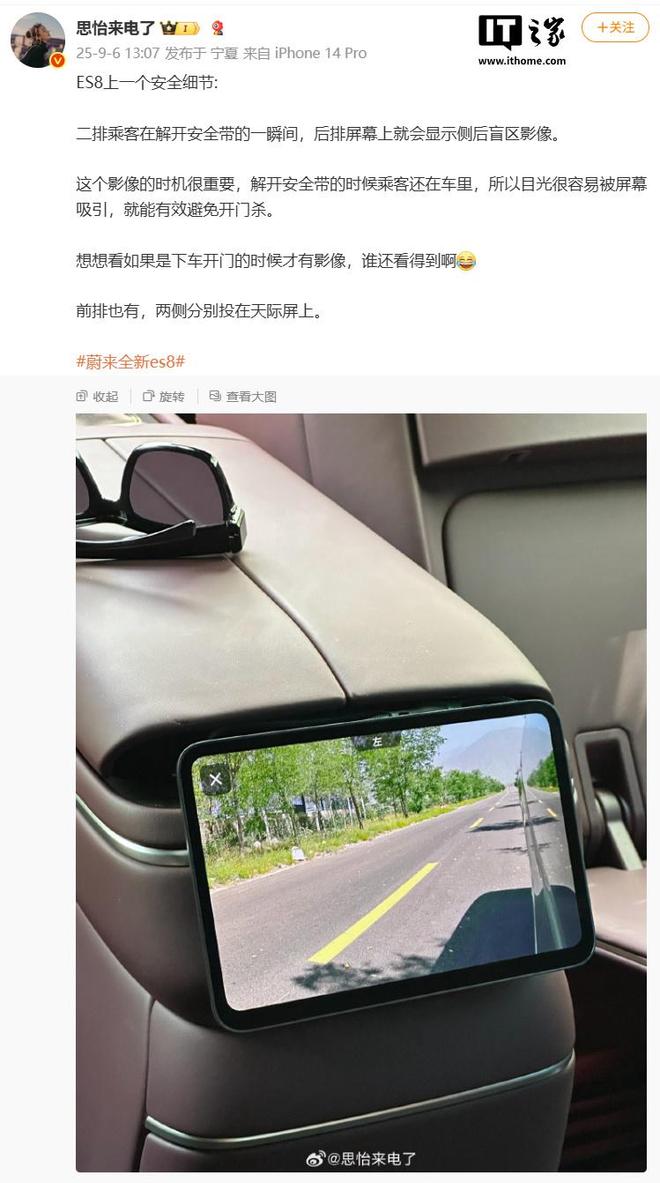 9月8日的Home报道说,Blogger @Siyi本周(9月6日)与Weibo分享了Nio ES8的反“谋杀”计划。博客作者分享说,当第二排乘客没有从安全带中删除时,后盲图像将显示在ES8的后屏幕上。同时,前排也有类似的操作,但是盲点的图像将分别放在天际线天际线的屏幕上。博客作者认为,此图像的时机“非常重要”。当安全带不焦虑时,乘客仍会疏散,因此屏幕可以很容易地吸引他们的眼睛。但是,如果仅在关闭汽车并打开门时可用图像,则乘客不会轻易注意到有此功能。博客作者还添加了评论部分,如果第二行的另一侧的乘客没有打败他们的安全带,那么S后面的盲点图片Creen将是“拆分屏幕”,以便两位乘客都可以在出口门的方向上看到盲区。后来,一个网民在评论部分说:“但是您必须知道,第二行(城市道路)都戴安全带。博客作者以及中国市场上最大的纯电动SUV。零脚的零重力座椅休息,达到“ MPV的主流水平”。