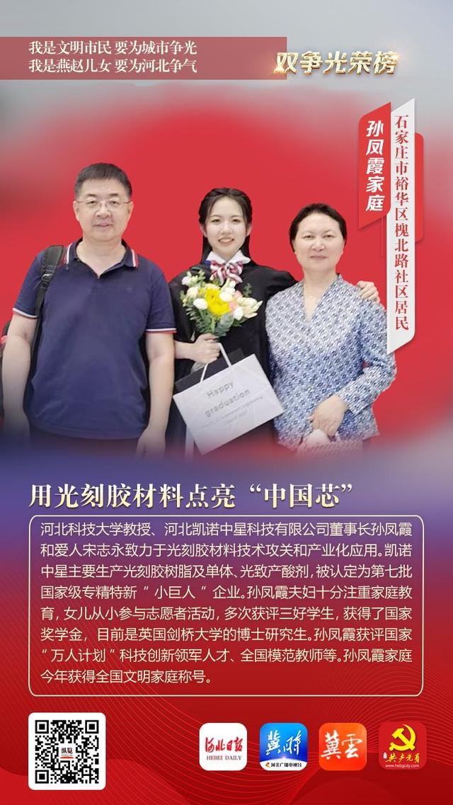 孙凤霞一家是石家庄市雨花区淮北路社区居民。河北科技大学教授、河北凯诺中兴科技有限公司董事长孙凤霞和女友宋志勇致力于光刻胶材料技术研究和产业化应用。凯诺中兴主要生产光刻胶树脂及单体、光致产酸剂。被认定为第七批国家级专精特新“小巨人”企业之一。孙凤霞和丈夫非常重视家庭教育。他们的女儿从小就参加志愿者活动。多次被评为三好学生之一,并获得国家奖学金。他目前是英国剑桥大学的博士生。孙凤霞被评为国家“万人计划”科技创新领军人才孙凤霞一家今年荣获全国文明家庭称号。